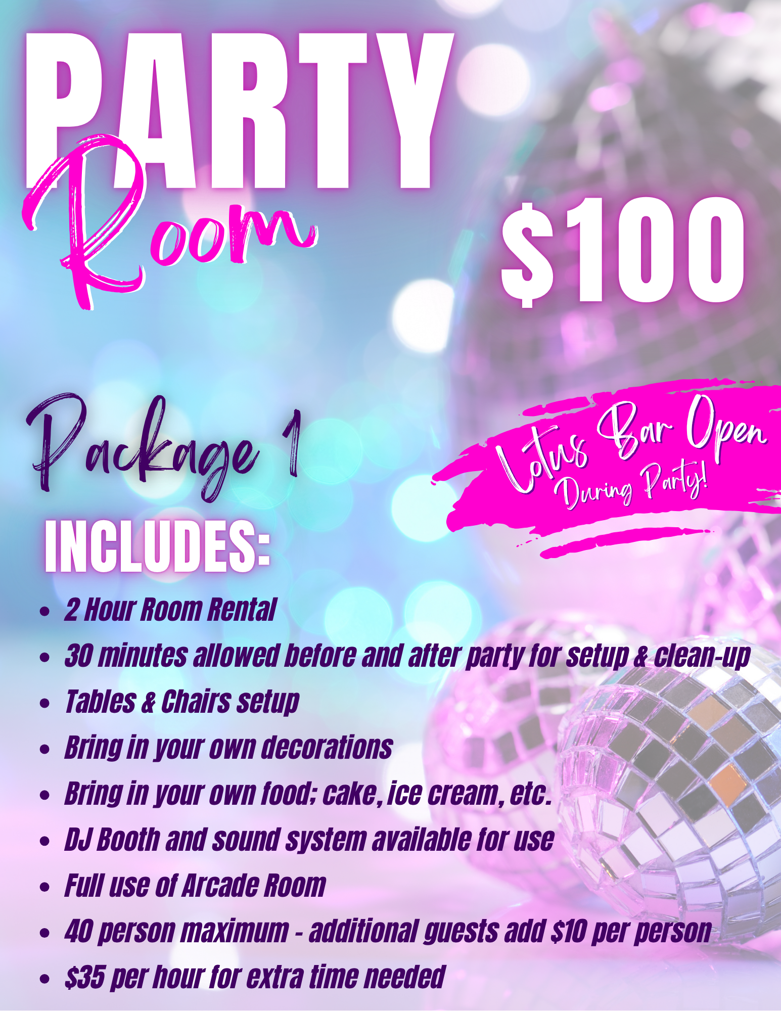 Our new location has a LOTUS BAR, EVENT SPACE & ARCADE ROOM!!
